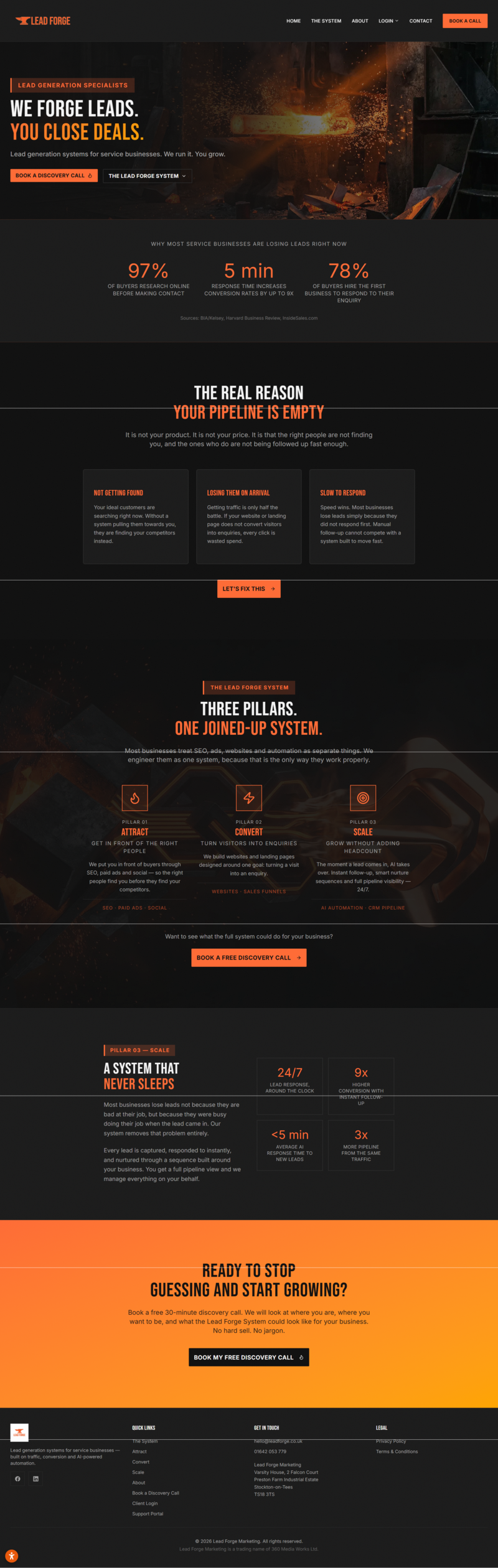 We are Lead Forge Marketing, a forward-thinking digital marketing agency committed to helping businesses transform their marketing into a consistent and scalable growth system. Our approach is built on the integration of key digital strategies, including local SEO, paid ads, marketing automation, and website design. By bringing these elements together, we create a unified framework that drives results and supports long-term success. We believe that effective marketing is not about isolated tactics—it’s about building systems that work together to achieve your business objectives. Our local SEO strategies are designed to increase your visibility within your target market, making it easier for potential customers to discover your business. We focus on optimizing your online presence to improve rankings, build trust, and drive relevant traffic. In parallel, our paid ads campaigns are crafted to deliver immediate results by targeting the right audience with precision. Through continuous testing and optimization, we ensure that your advertising efforts generate high-quality leads and maximize return on investment. A critical component of our strategy is creating impactful website design that enhances user experience and drives conversions. We develop websites that are not only visually engaging but also strategically structured to guide visitors toward taking action. Every element, from layout to content, is optimized to support your marketing goals and improve overall performance. Your website becomes a central hub that connects all aspects of your digital strategy. To ensure efficiency and scalability, we leverage marketing automation to streamline processes and maintain consistent engagement with your audience. Our systems are designed to nurture leads, track interactions, and deliver personalized communication at every stage of the customer journey. By integrating automation with your local SEO and paid ads efforts, we create a seamless and effective marketing ecosystem. At Lead Forge Marketing, we are dedicated to delivering measurable results and long-term value. As your digital marketing agency partner, we continuously analyze data, refine strategies, and adapt to changing trends to ensure ongoing success. Our goal is to empower your business with the tools, systems, and expertise needed to thrive in a competitive environment. Together, we build marketing solutions that not only generate leads but also drive sustainable growth and lasting impact.